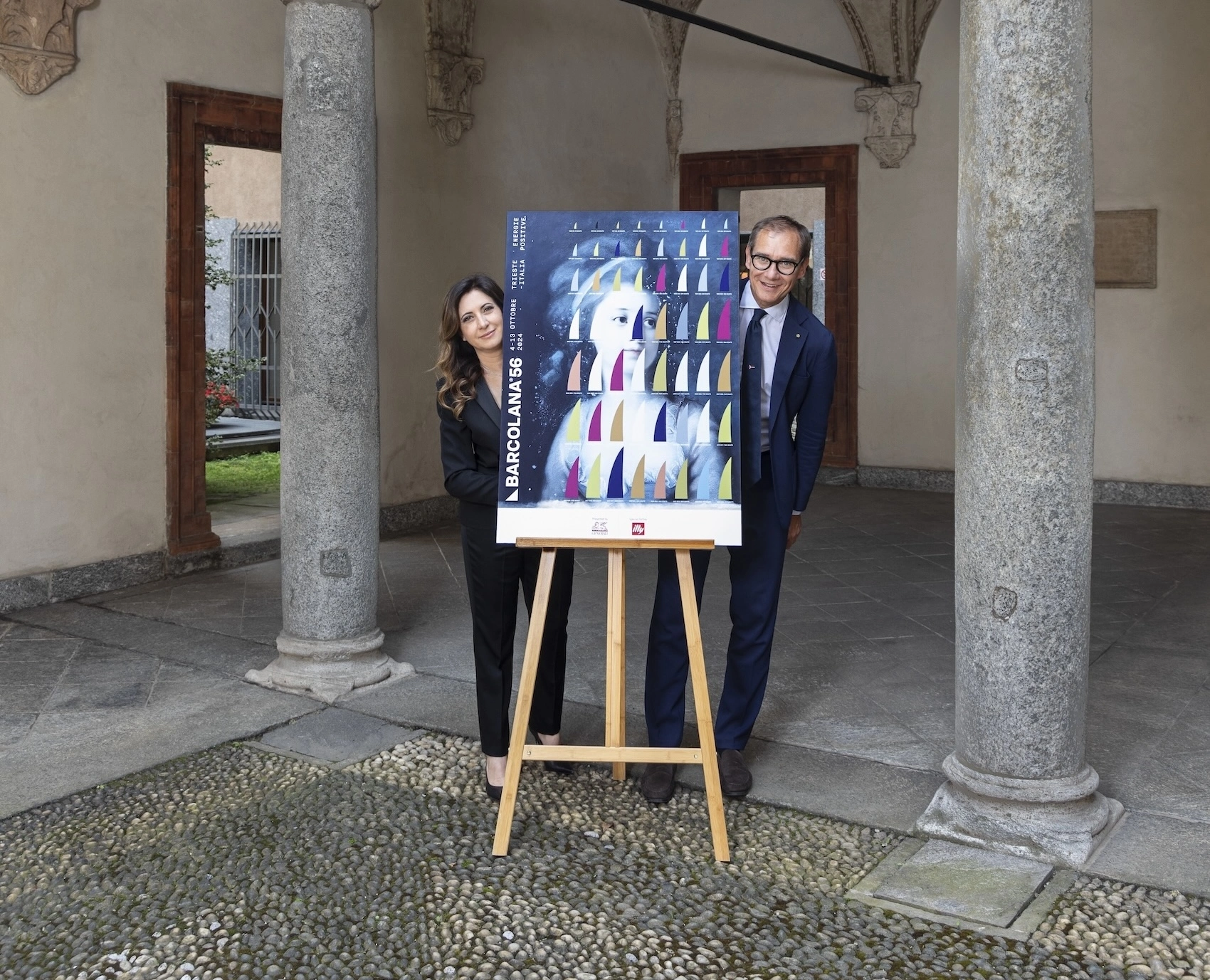 Der Künstler möchte einen Dialog zwischen den pastellfarbenen Segeln und dem antiken Ölgemälde schaffen, das eine festlich gekleidete Frau aus dem 19. Jahrhundert zeigt. In ihr erkennen illycaffè und Barcolana eine weitere Botschaft, die mit der Entwicklung der Rolle der Frau in der Welt des Segelns und darüber hinaus verbunden ist."